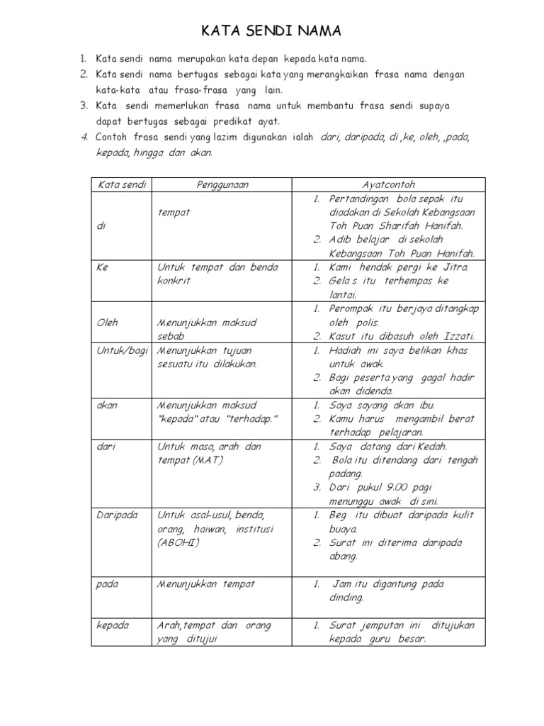 Contoh Kata Sendi Nama Tahun 6