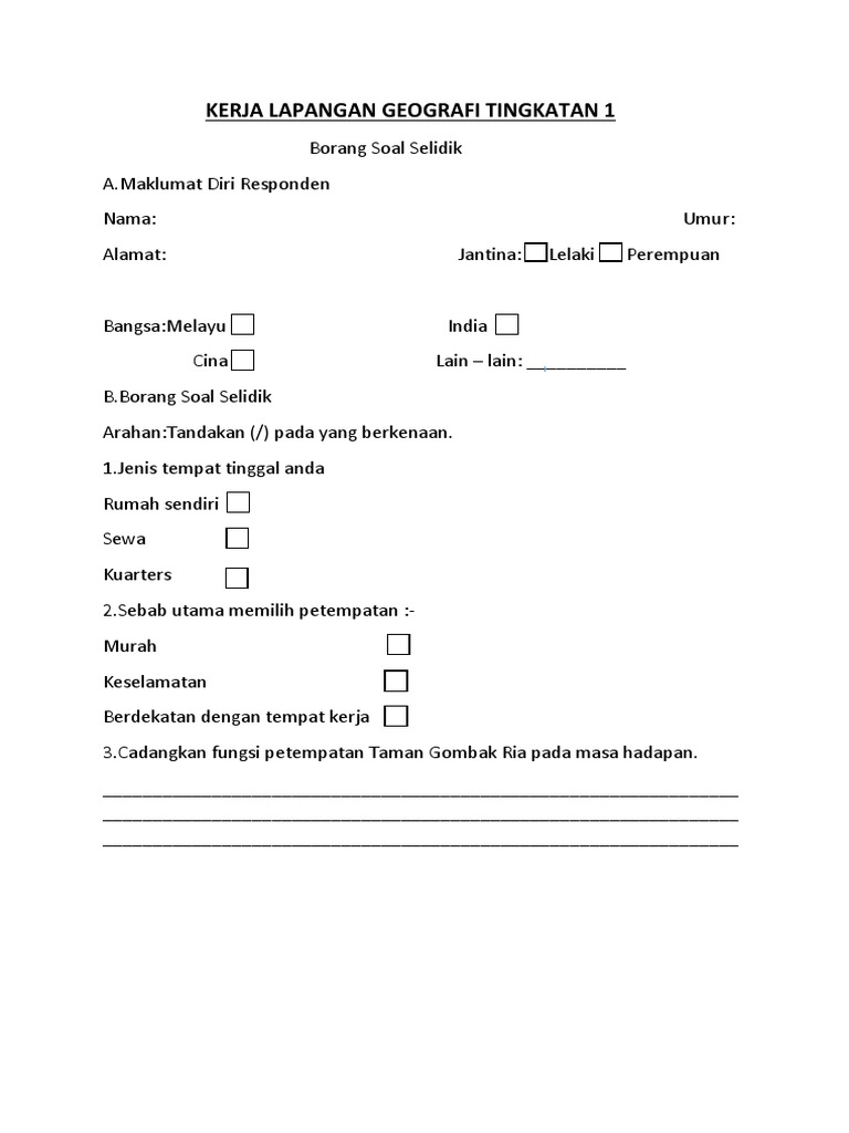 Borang Soal Selidik Temu Bual Kerja Lapangan Tugasan Geografi Tingkatan 3 Bumi Gemilang