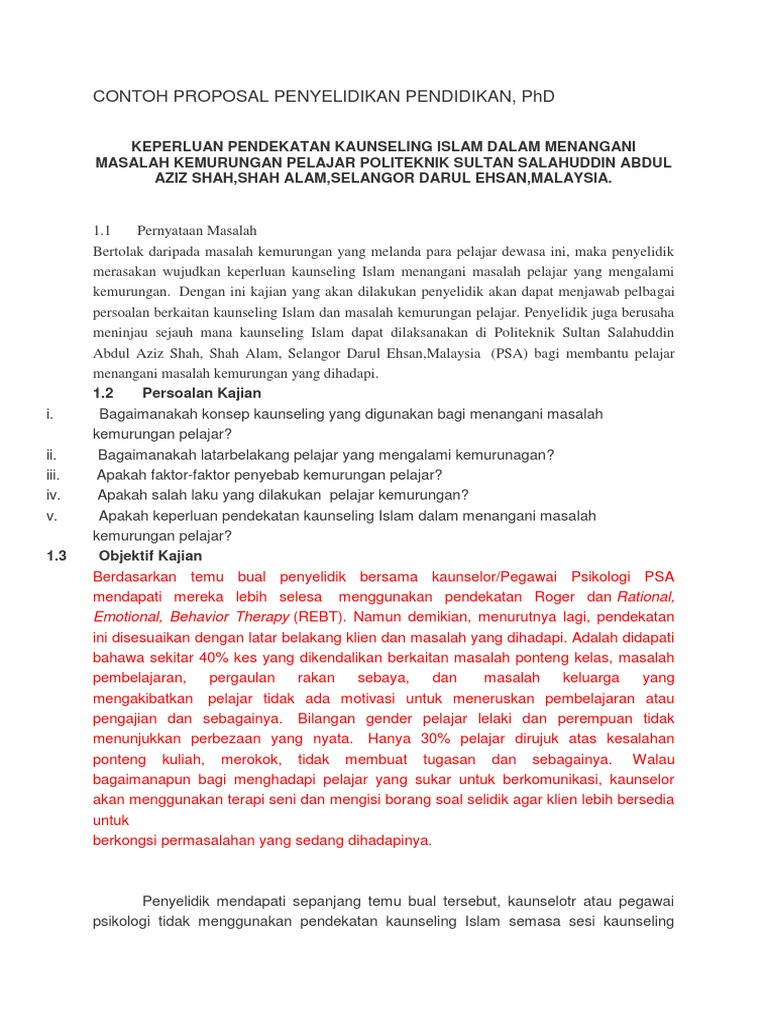 Pdf Contoh Proposal Penyelidikan Pendidikan Phd Keperluan Pendekatan Kaunseling Islam Dalam Menangani Masalah Kemurungan Pelajar Politeknik Sultan Salahuddin Kaharuia Kaharuia Academia Edu