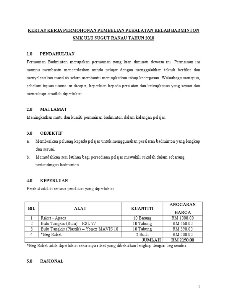 Kertas Kerja Permohonan Penajaan Kejohanan Badminton Piala Tun Dr Siti Hasmah Mohd Ali Hascup 2014 Tarikh 1 Hingga 4 Mei Pdf Download Gratis