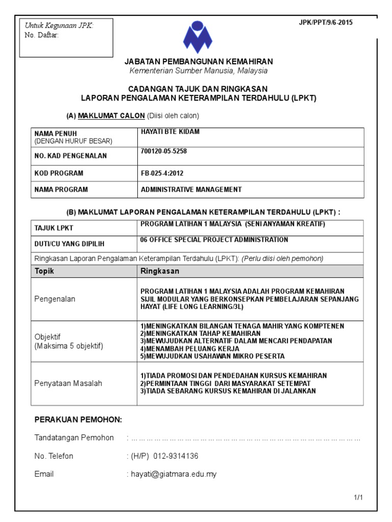 Bagi permohonan yang memohon program pegawai latihan vokasional i 031 3 mestilah memiliki pengalaman dalam bidang yang berkaitan seperti berikut. Pdf contoh lpkt dlk tahap suriati ali academia edu. Pelaksanaan laporan pengalaman keterampilan terdahulu lpkt melalui kaedah ppt anjuran. Jpk ppt 9 6 2015 cadangan tajuk lpkt contoh 1.