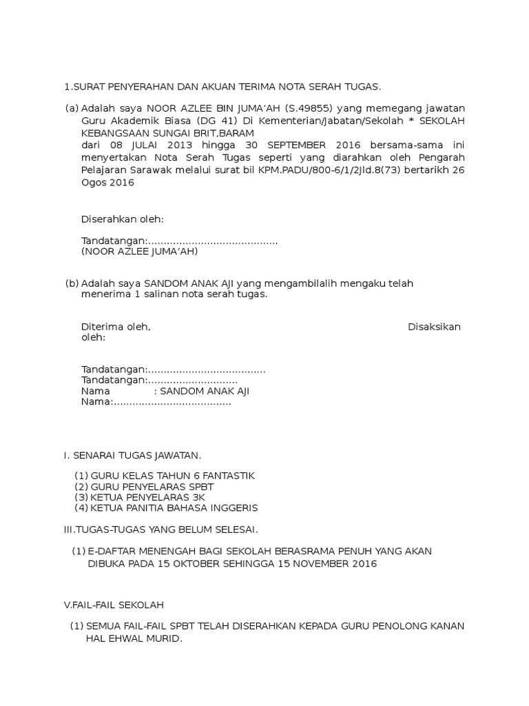 Contoh Nota Serah Tugas Perlu Diisi Untuk Guru Yang Berpindah Keluar