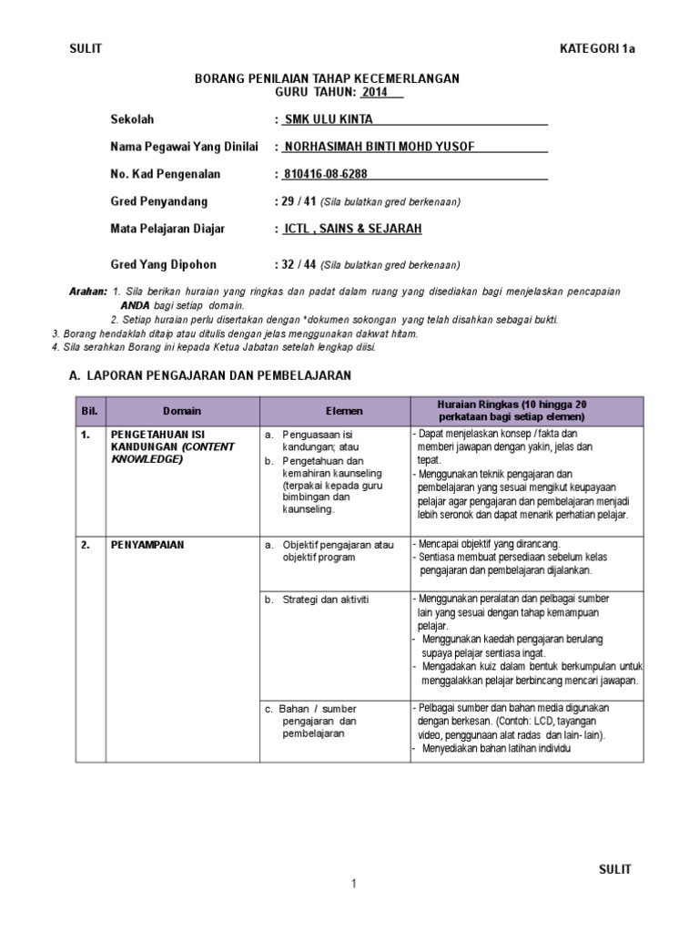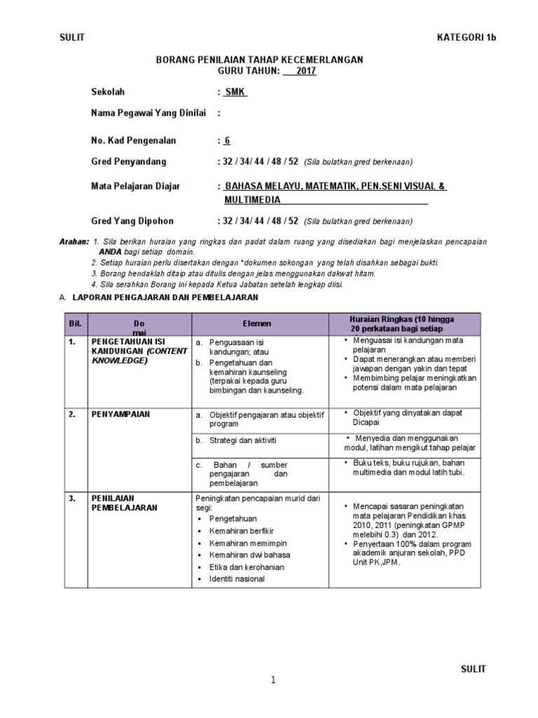 Doc Borang Penilaian Tahap Kecemerlangan Guru Borang Kategori 1b Guru Nor Asmah Awang Academia Edu