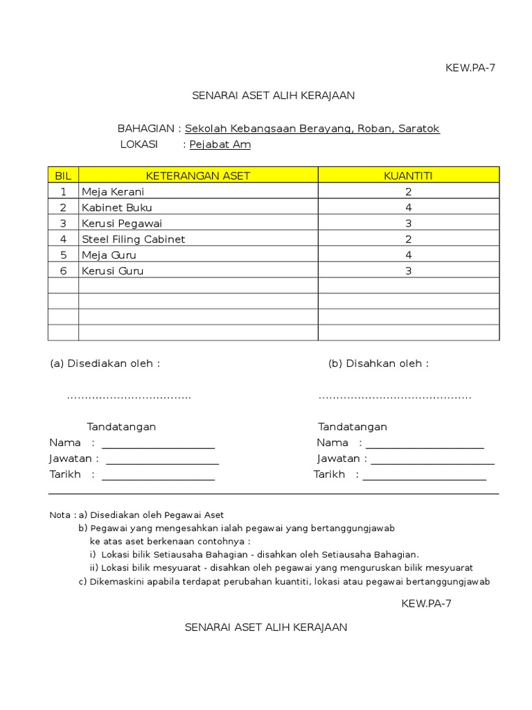 Semua tawaran dengan maklumat yang lengkap hendaklah menggunakan sampul surat berlakri dan ditanda no. 7 4 daftar inventori kew. Laporan 23 laporan tahunan harta modal dan inventori disediakan dalam kew pa 8 dan kemukakan ke jpn ppd sebelum 15 mac tahun berikutnya. Contoh kew pa 7 hazrie hamid.