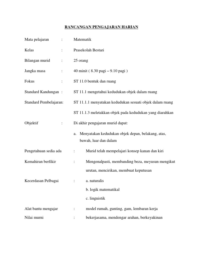 Contoh Rancangan Pengajaran Harian Prasekolah