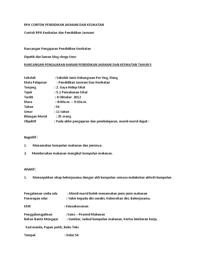Rph Contoh Pendidikan Jasmani Dan Kesihatan Docx