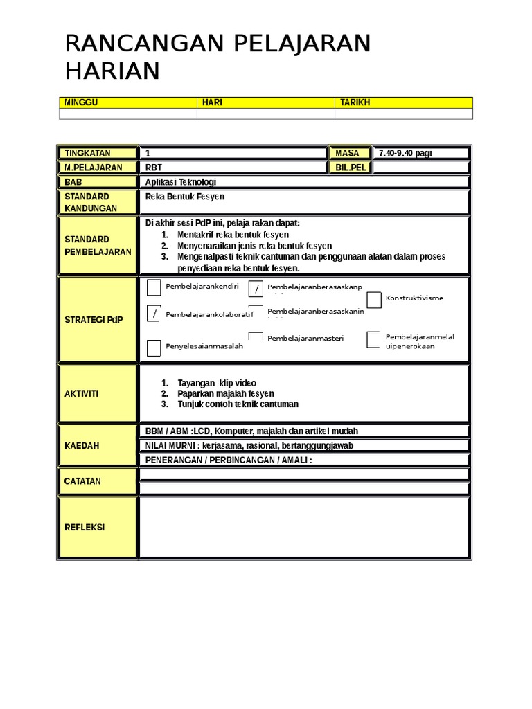 Contoh Rancangan Pengajaran Harian Bahasa Melayu Tingkatan 1