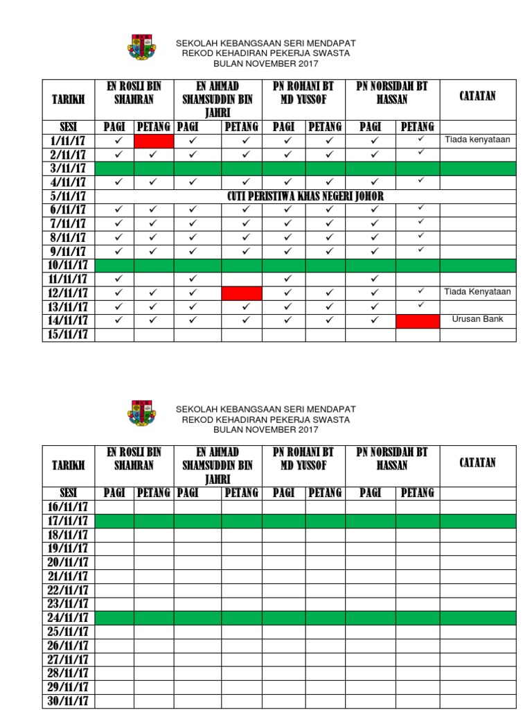 Borang Semakan Kehadiran Harian Pekerja Pembersihan Kawasan Di Sekolah