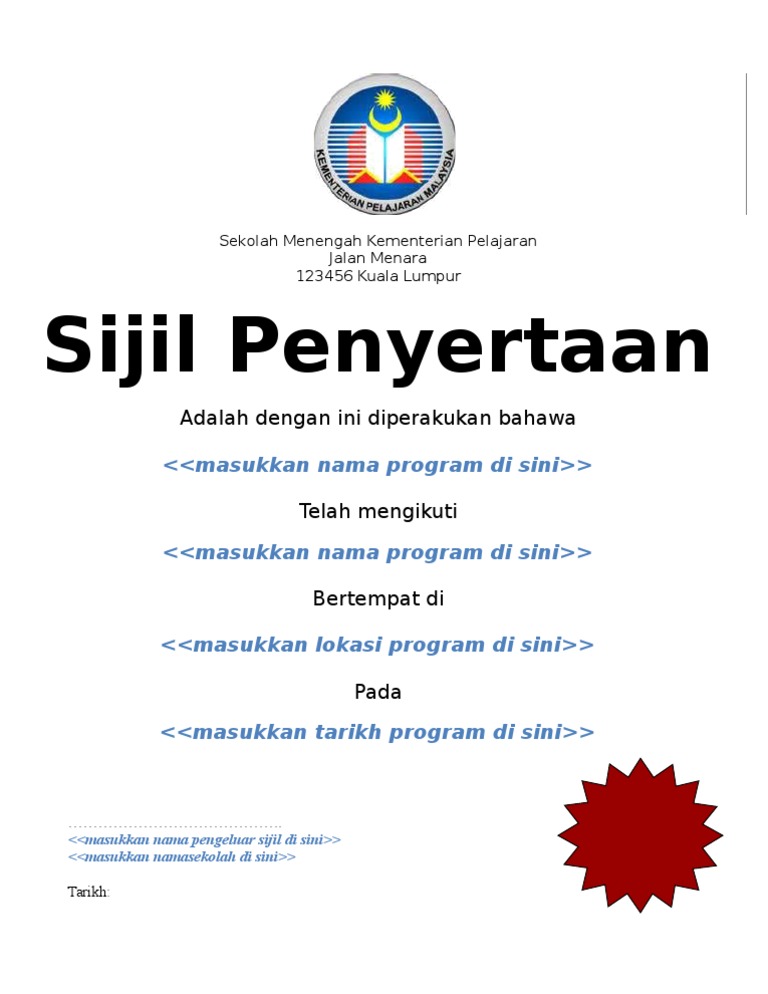 Contoh Sijil Penghargaan Dan Penyertaan