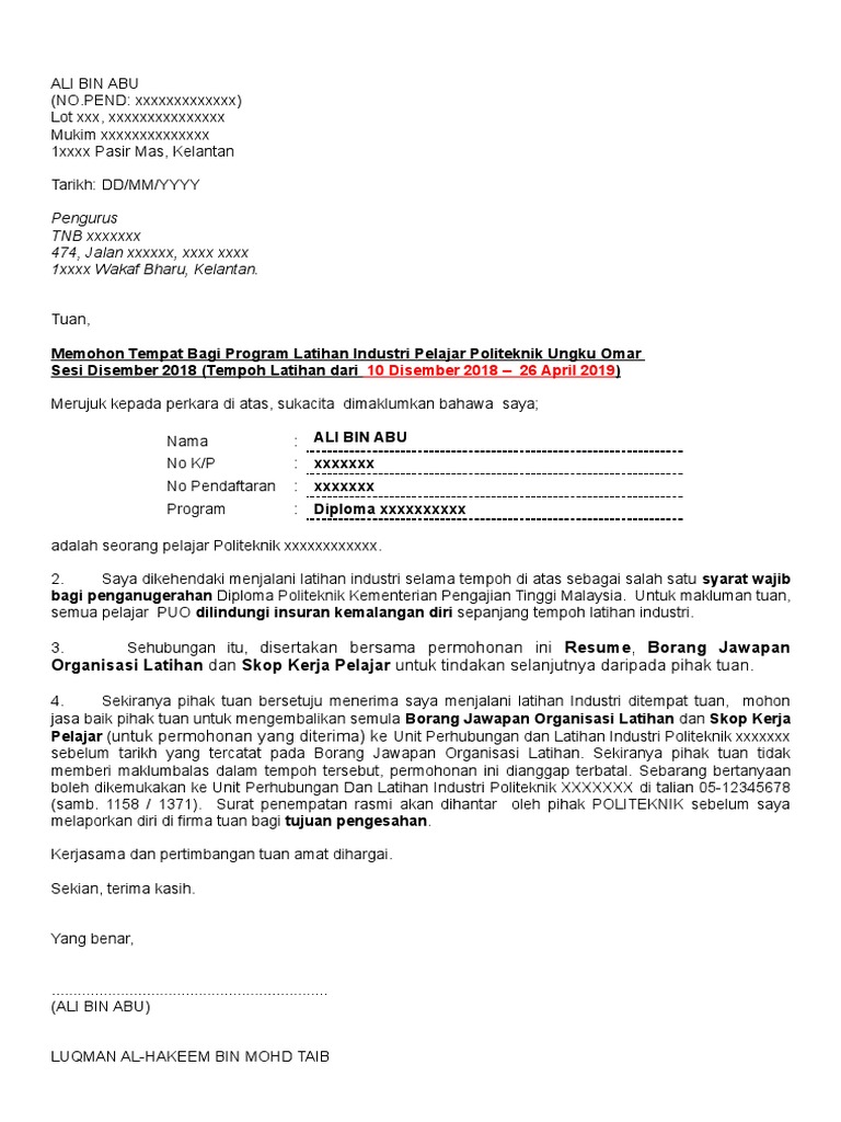 Contoh Surat Pemohonan Tempat Latihan Industri Politeknik