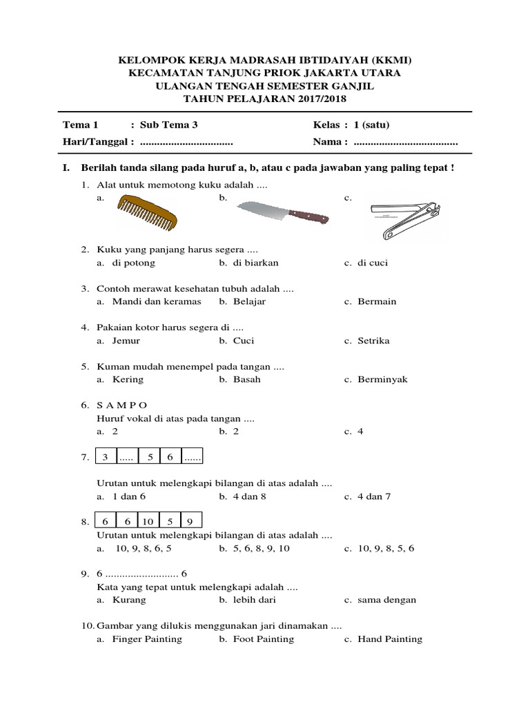 Contoh Soal Ulangan Harian Kelas 1 Sd Semester 1 Tema 1 Diriku