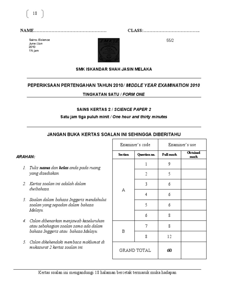 Soalan Peperiksaan Akhir Tahun 2018 Kssm Tingkatan 1 Sains