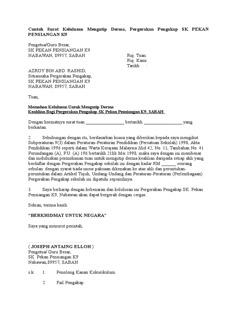 Surat Memohon Sumbangan Daripada Ibu Bapa