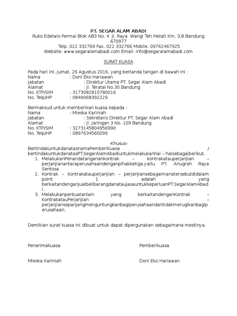 Contoh Surat Kuasa Mewakili Perusahaan Untuk Penandatanganan Perjanjian