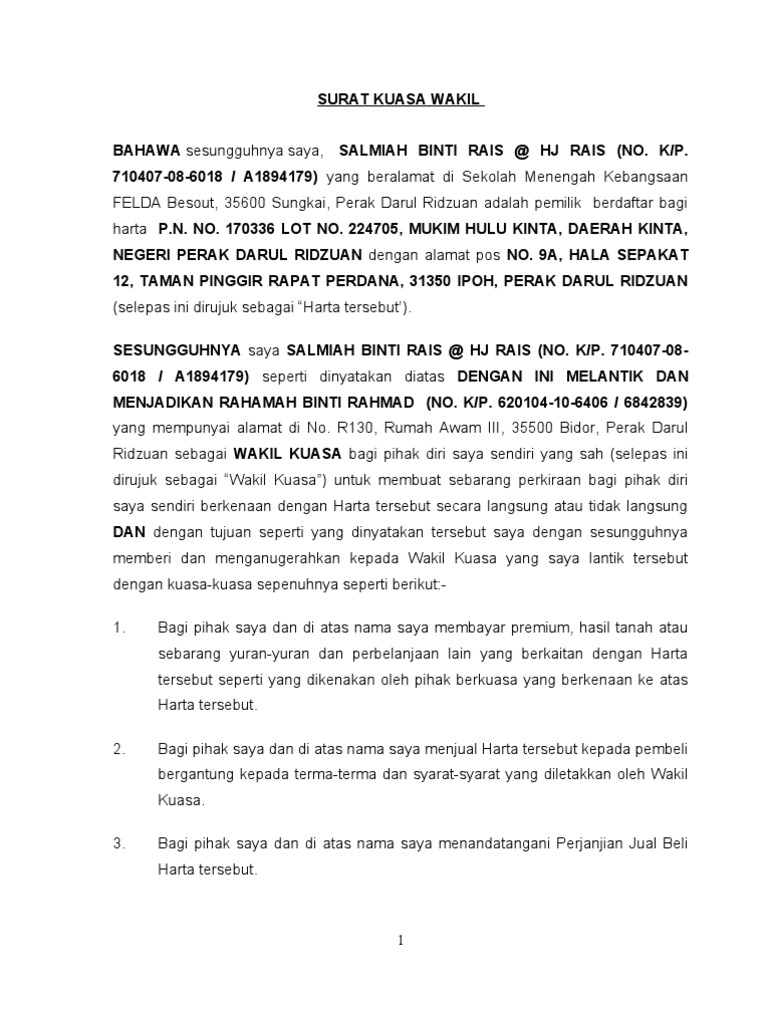 Contoh Surat Kuasa Wakil Jual Tanah Di Malaysia