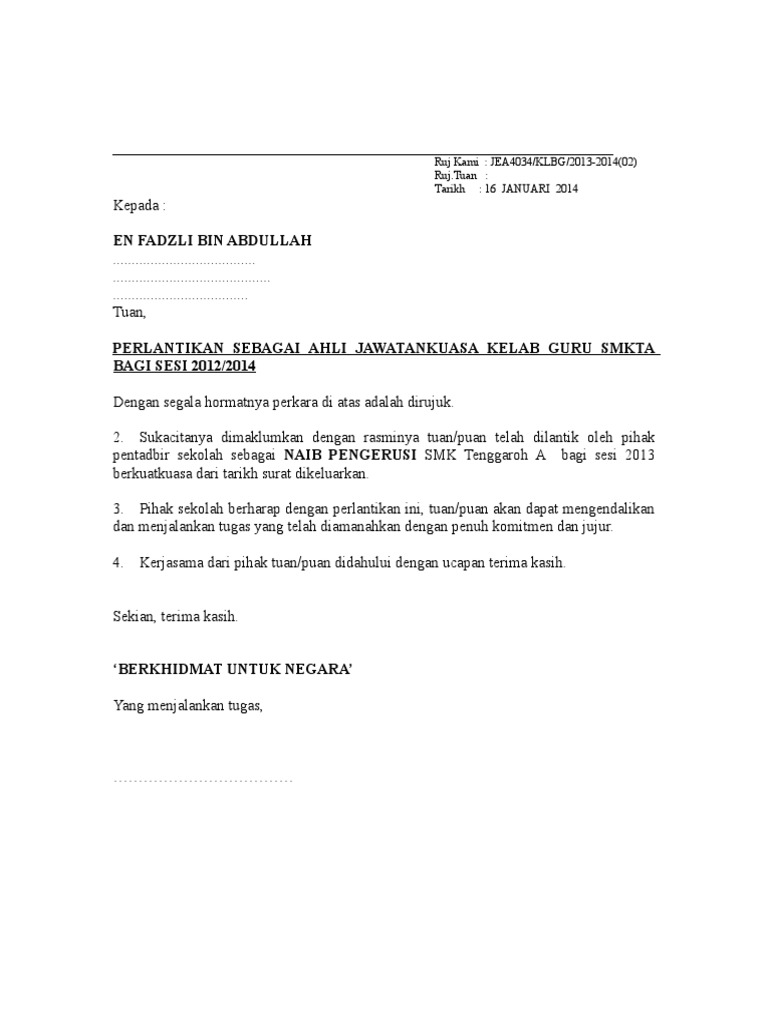 Contoh Surat Lantikan Ajk Program