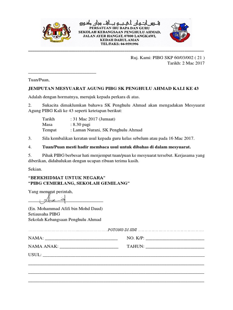 Surat Jemputan Ke Mesyuarat Agung Pibg Kali Ke 14 2016