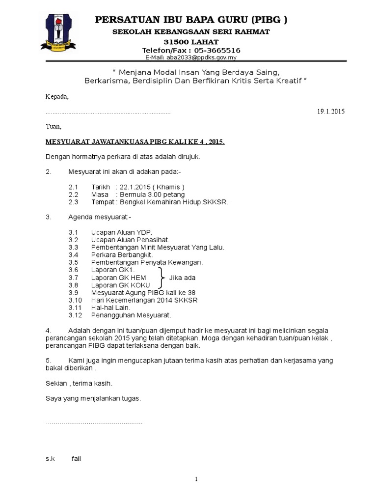 Pibg Surat Jemputan Mesyuarat Ajk Pibg Kali Pertama 2014
