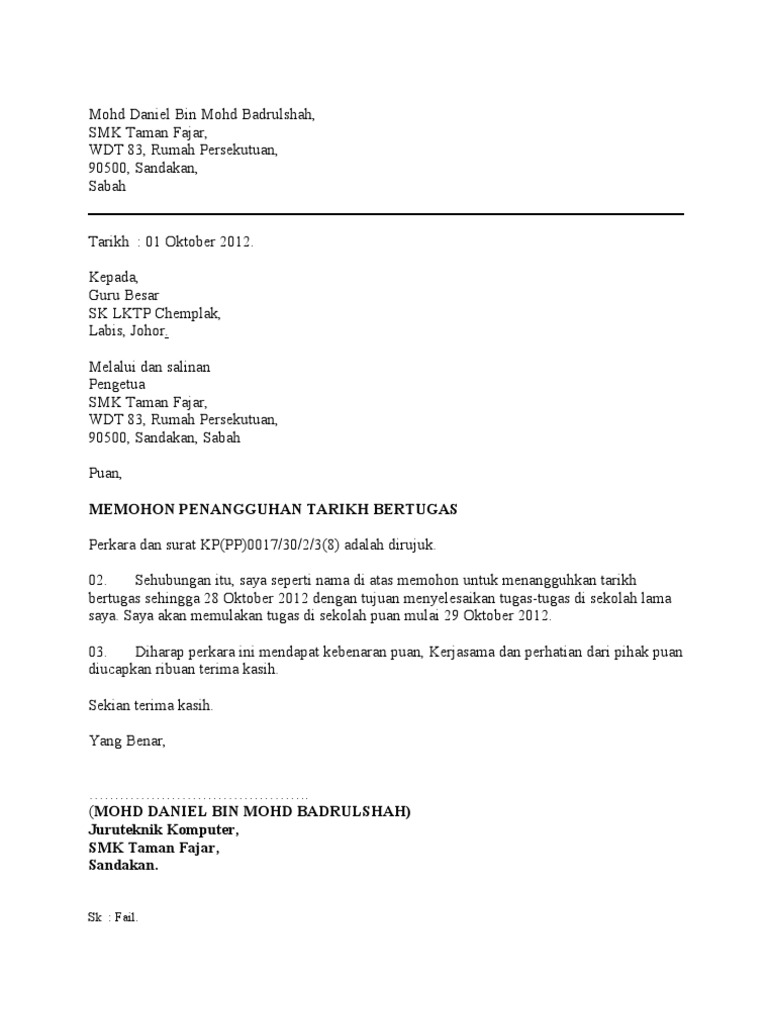 Contoh Surat Rasmi Permohonan Tangguh Kerja Rasmi L
