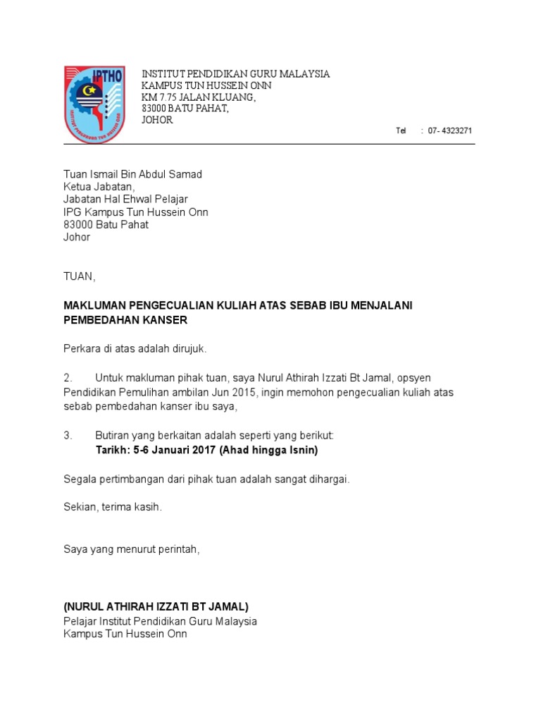 Surat Rasmi Pengecualian Kuliah Surat Rasmi Z