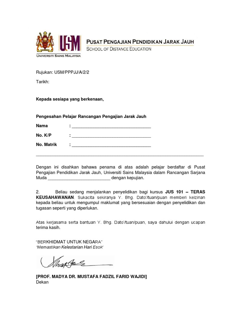 Contoh Surat Pengesahan Pelajar Dari Pusat Pengajian Pdf