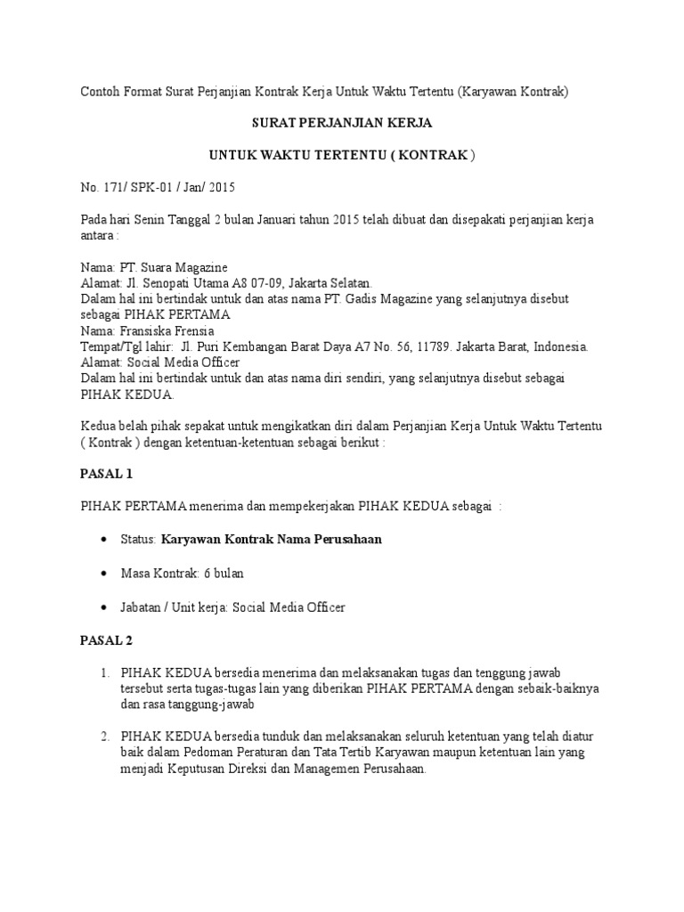 Contoh Surat Perjanjian Kerja Waktu Tertentu Pdf Contoh Seputar Surat