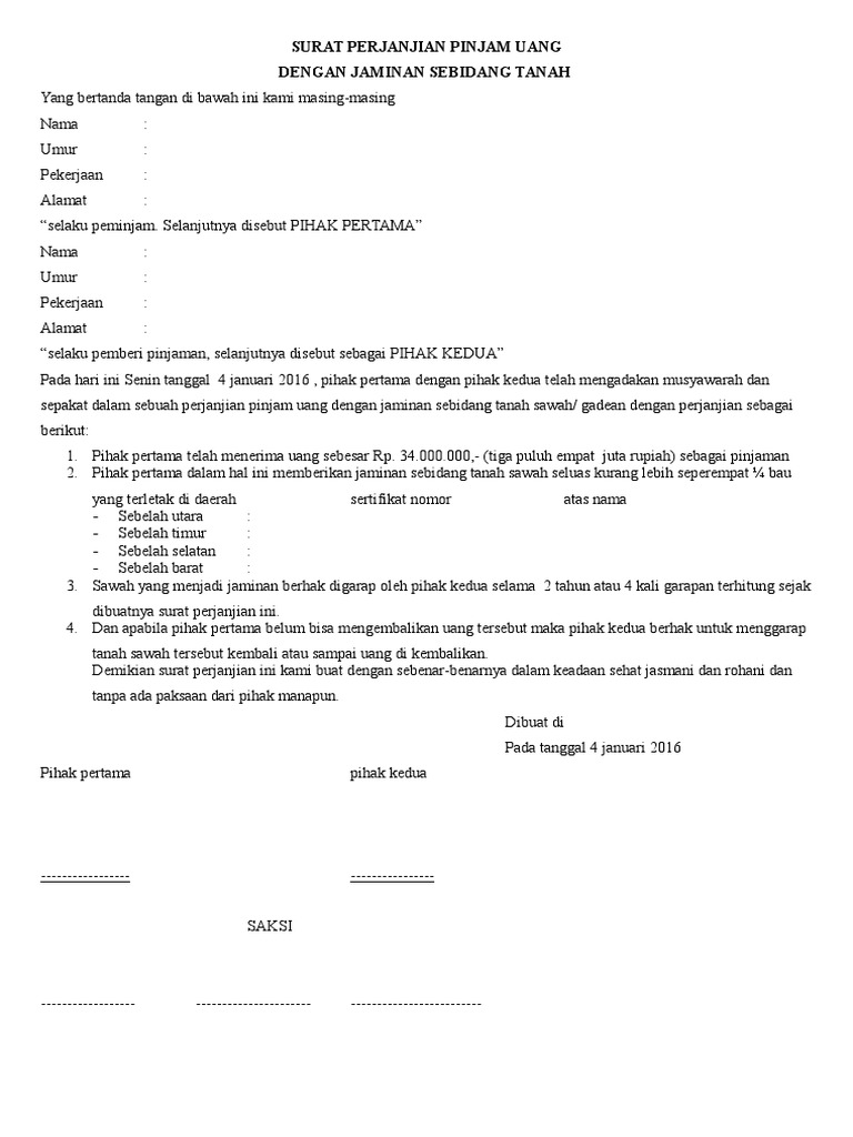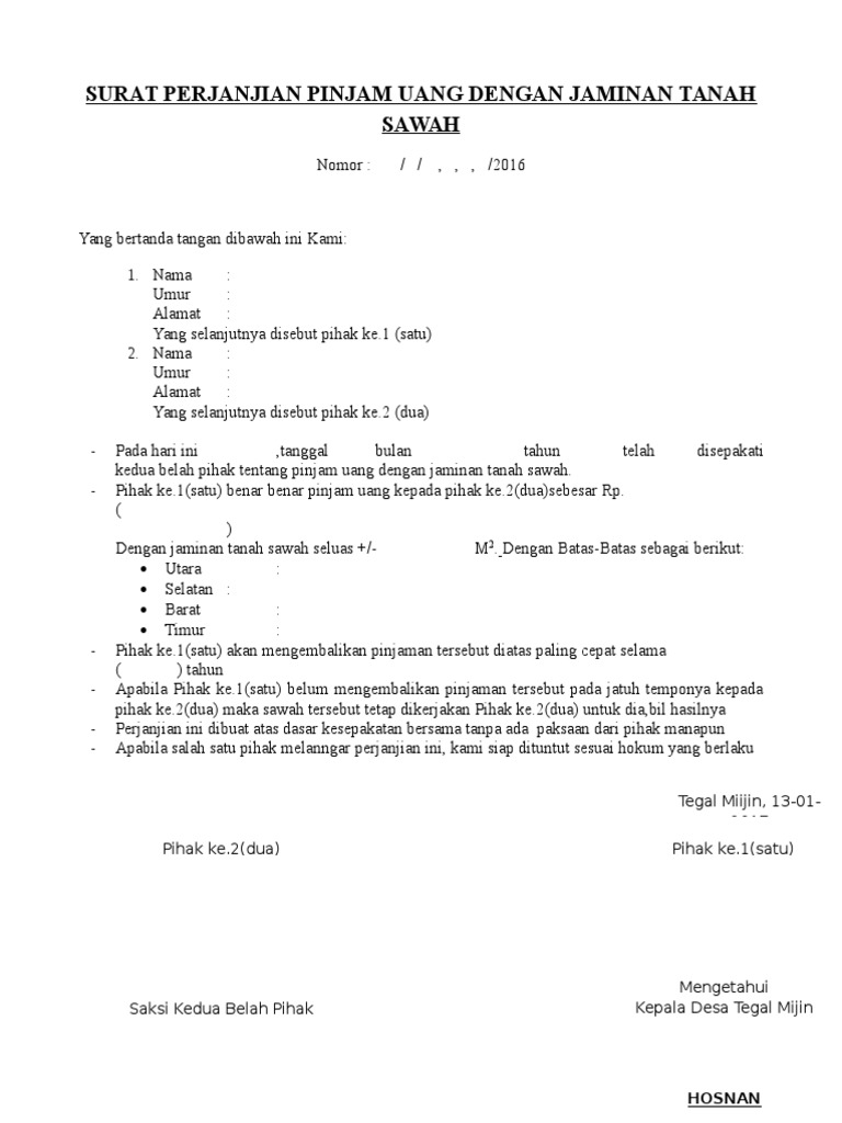 Surat Perjanjian Pinjam Uang Dengan Jaminan Tanah Sawah Rtf