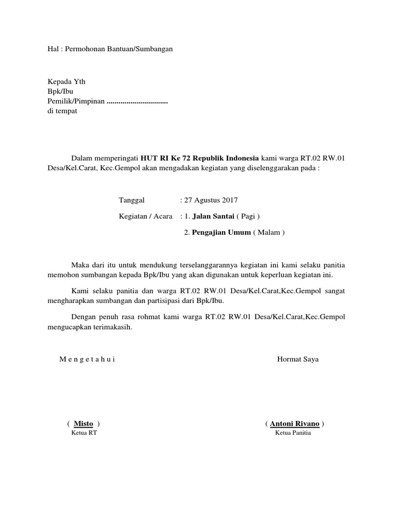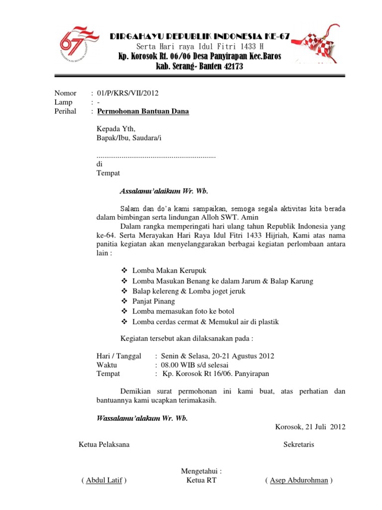 Contoh Surat Permohonan Bantuan Dana Kegiatan 17 Agustus Doc