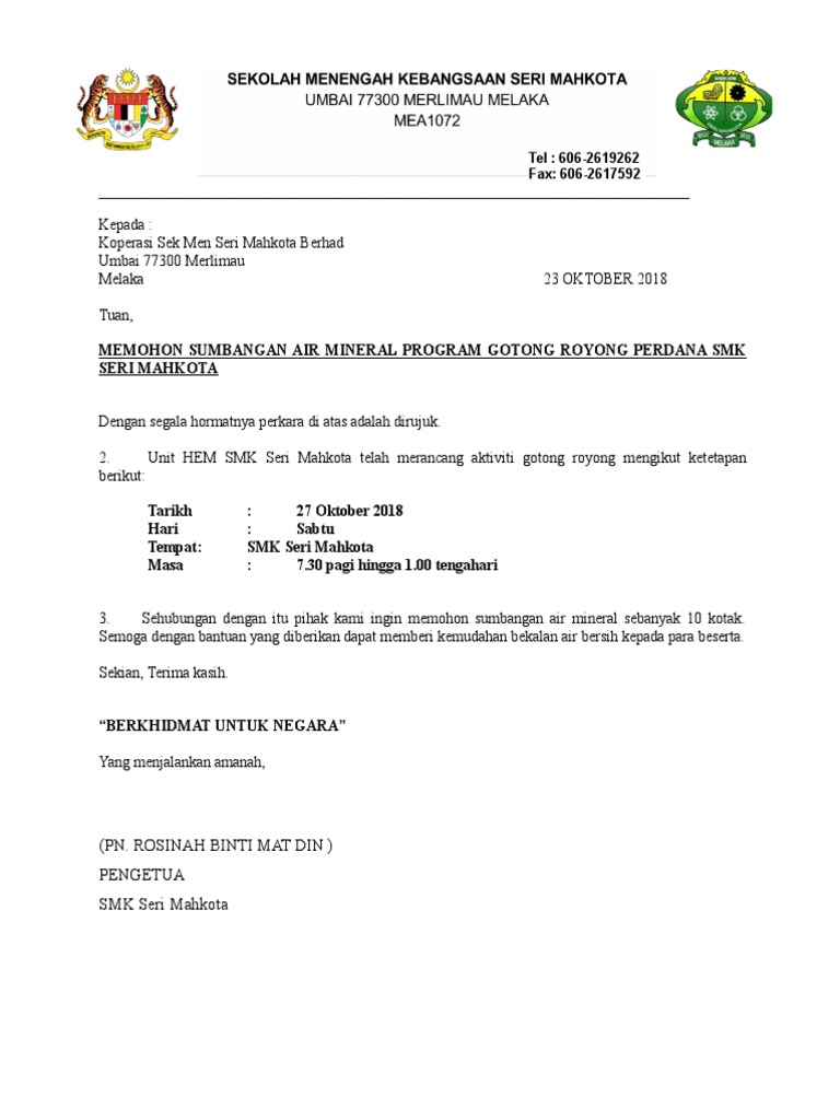 Surat Memohon Sumbangan Air Mineral