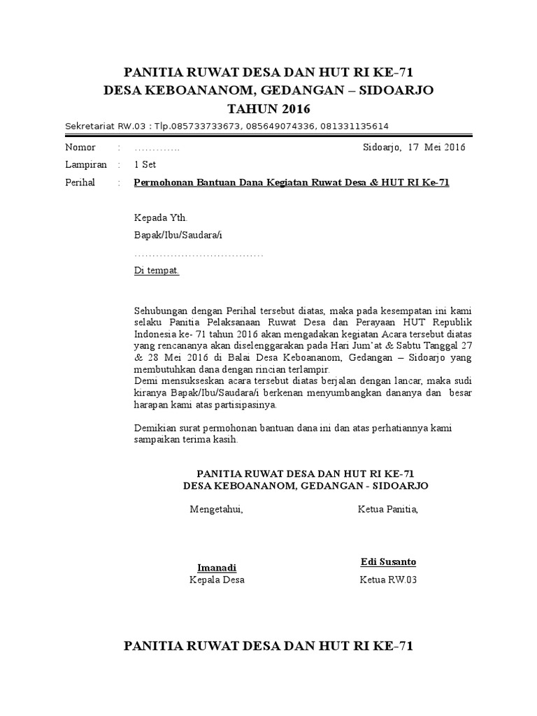 Contoh Surat Permohonan Bantuan Dana Dan Proposal Kegiatan Hut Ri