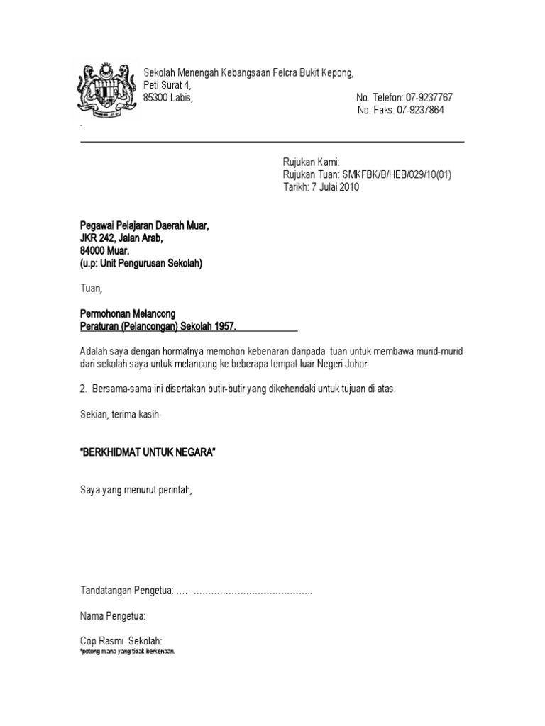 Surat Memohon Kebenaran Mengadakan Lawatan Sambil Belajar