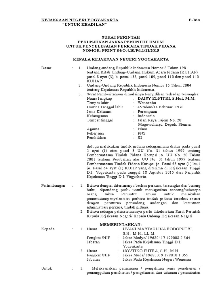 2 P 16a Surat Perintah Penunjukan Jaksa Penuntut Umum Untuk Penyelesaian Perkara Tindak Pidana