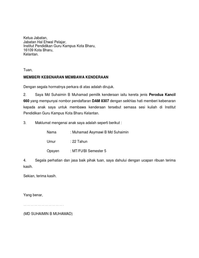 Contoh Surat Rasmi Memohon Kebenaran Membawa Kenderaan