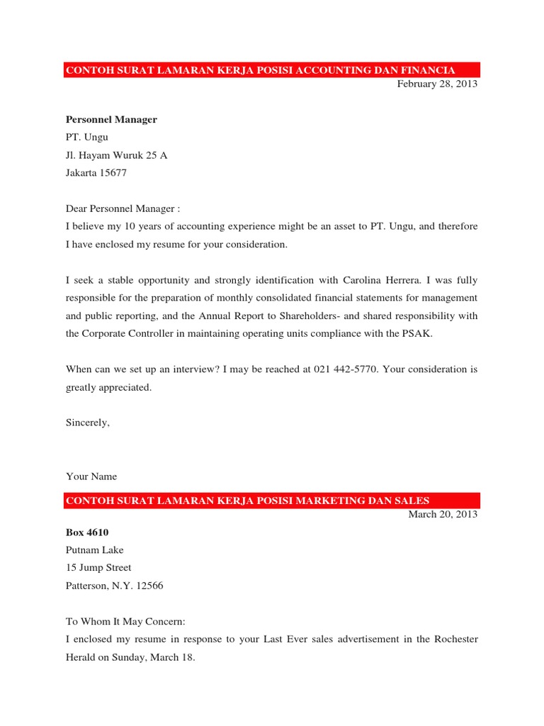 Contoh Surat Lamaran Kerja Posisi Accounting Dan Financia Sales Business