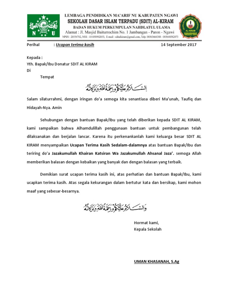 Contoh Surat Ucapan Terima Kasih Kepada Donatur Masjid