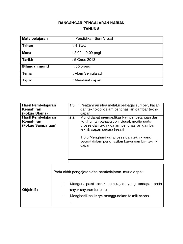 Rancangan Pengajaran Harian Pendidikan Seni Visualtahun 3