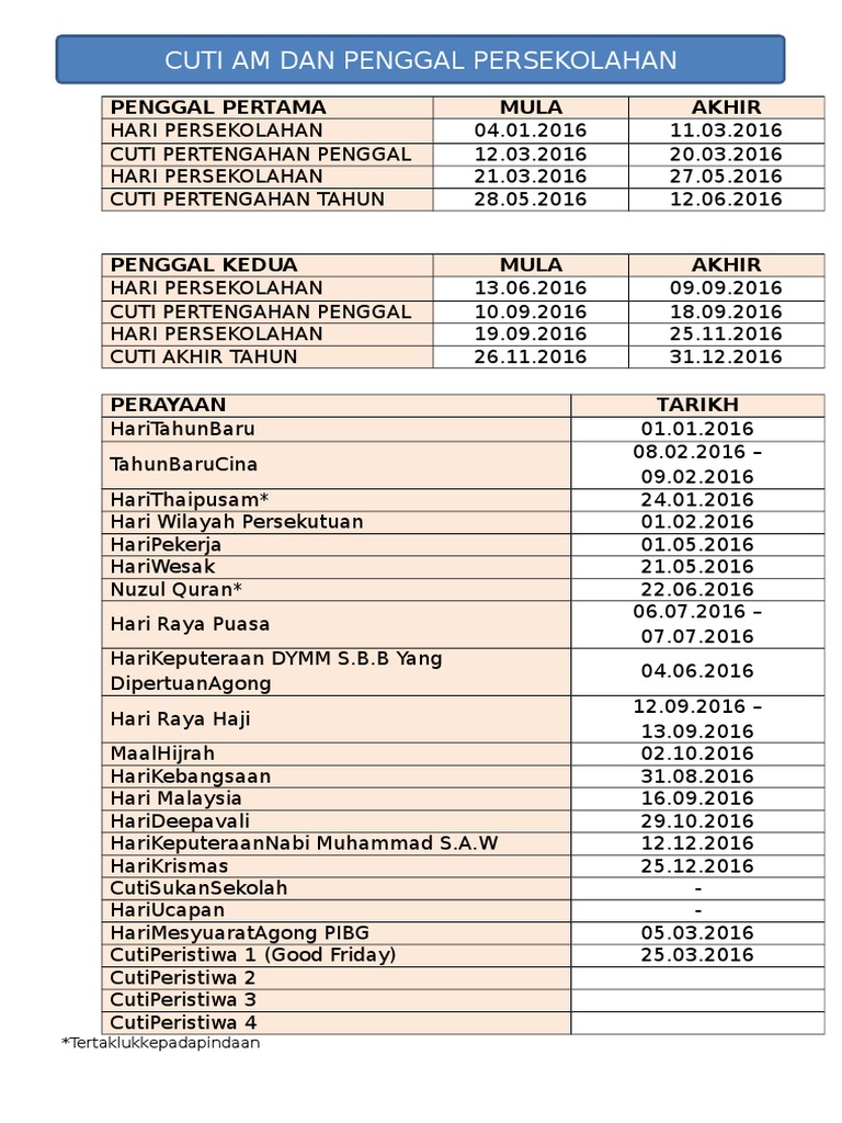 Berikut adalah jadual cuti sekolah untuk sesi persekolahan 2016 seperti yang dimaklumkan kpm di dalam takwim penggal persekolahan tahun 2016. Cuti umum sarawak 2016 cuti kelepasan am dan cuti persekolahan bagi sarawak untuk tahun 2016. Pembukaan penggal pertama persekolahan 2021 bagi sekolah di seluruh negara ditetapkan pada rabu 20 januari 2021. Foto sharul hafiz zam murid murid dari sekolah kebangsaan tunku abdul halim gembira selepas tamat waktu sesi persekolahan bagi tahun 2016 yang berakhir pada hari ini 24 november 2016 bagi negeri kedah terengganu kelantan dan johor.