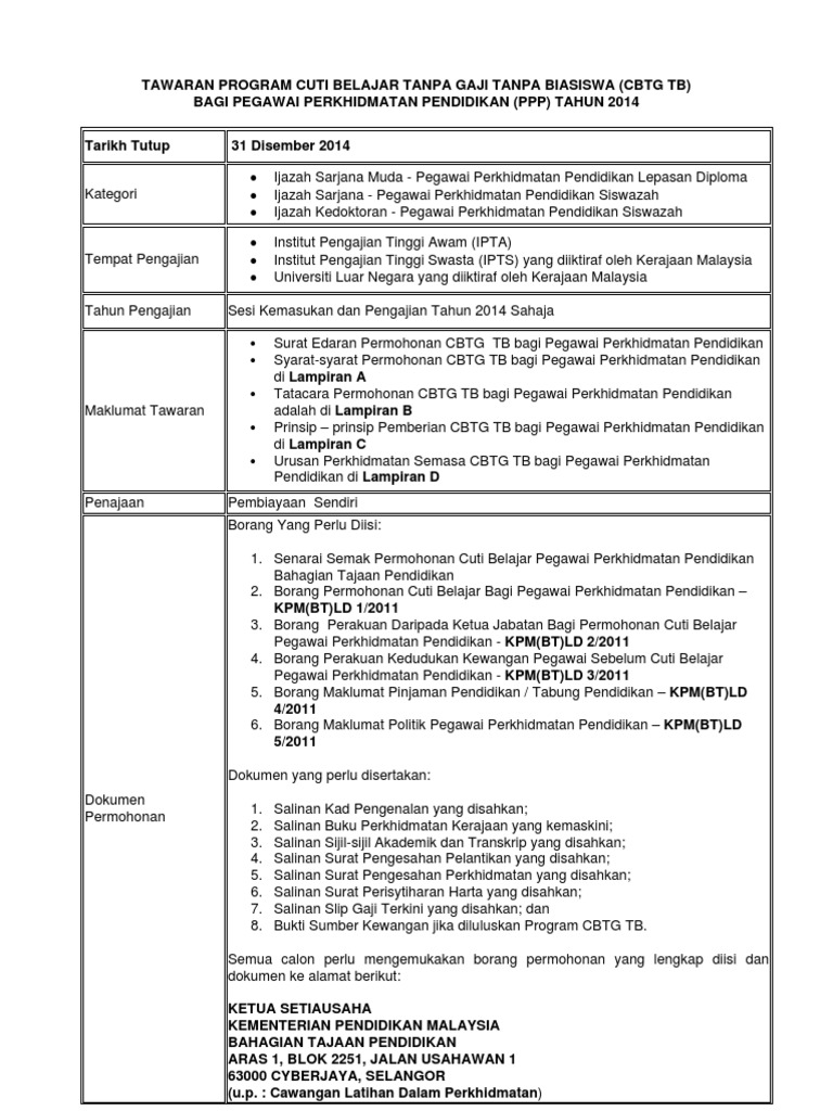 Tawaran Cuti Belajar Tanpa Gaji Tanpa Biasiswa Cbtg Tb Bagi Pegawai Perkhidmatan Pendidikan Ppp 2013
