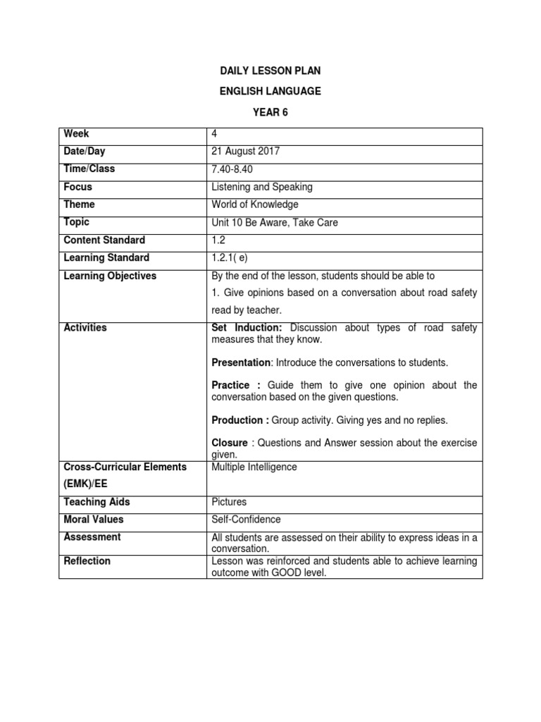Great Daily Lesson Plan Form 1 Let S Learn English The Easy Way Lesson Plan Unit 6 Safe An Ota Tech