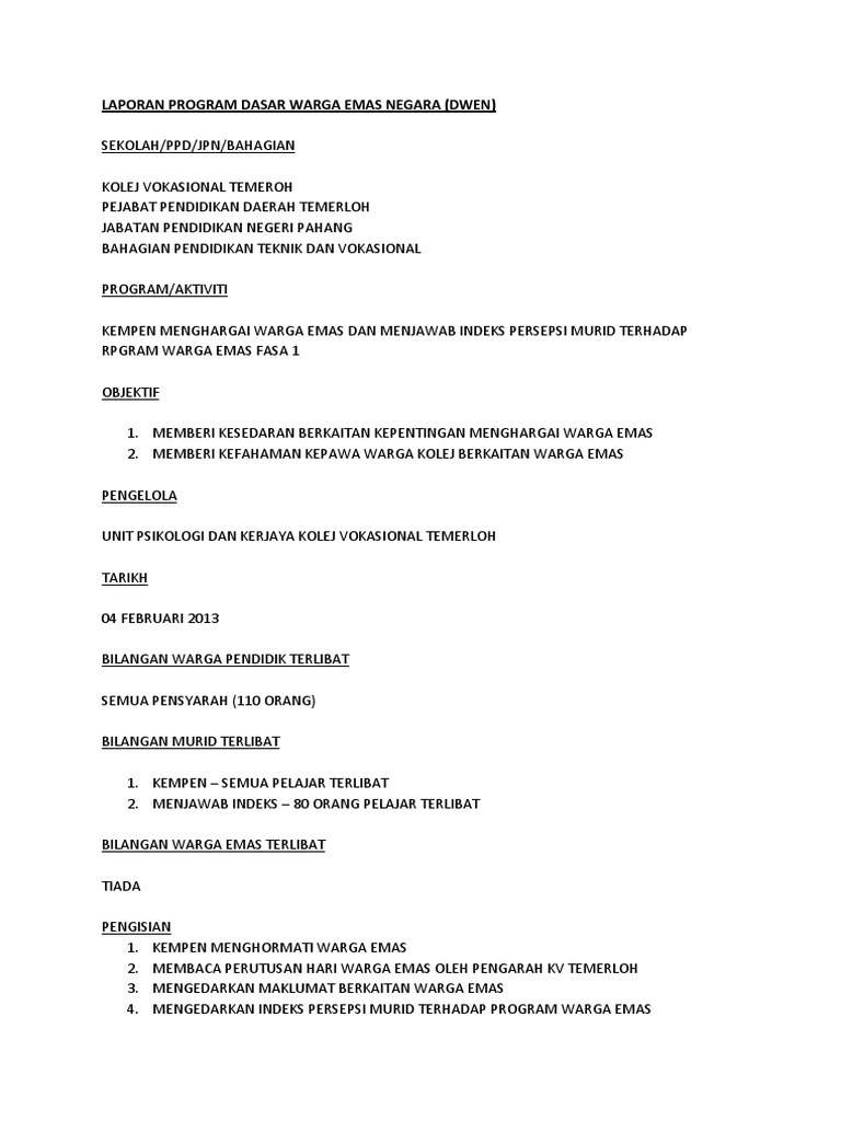 Program Dasar Warga Emas Negara Dwen Sk Kemendor Melaka Facebook