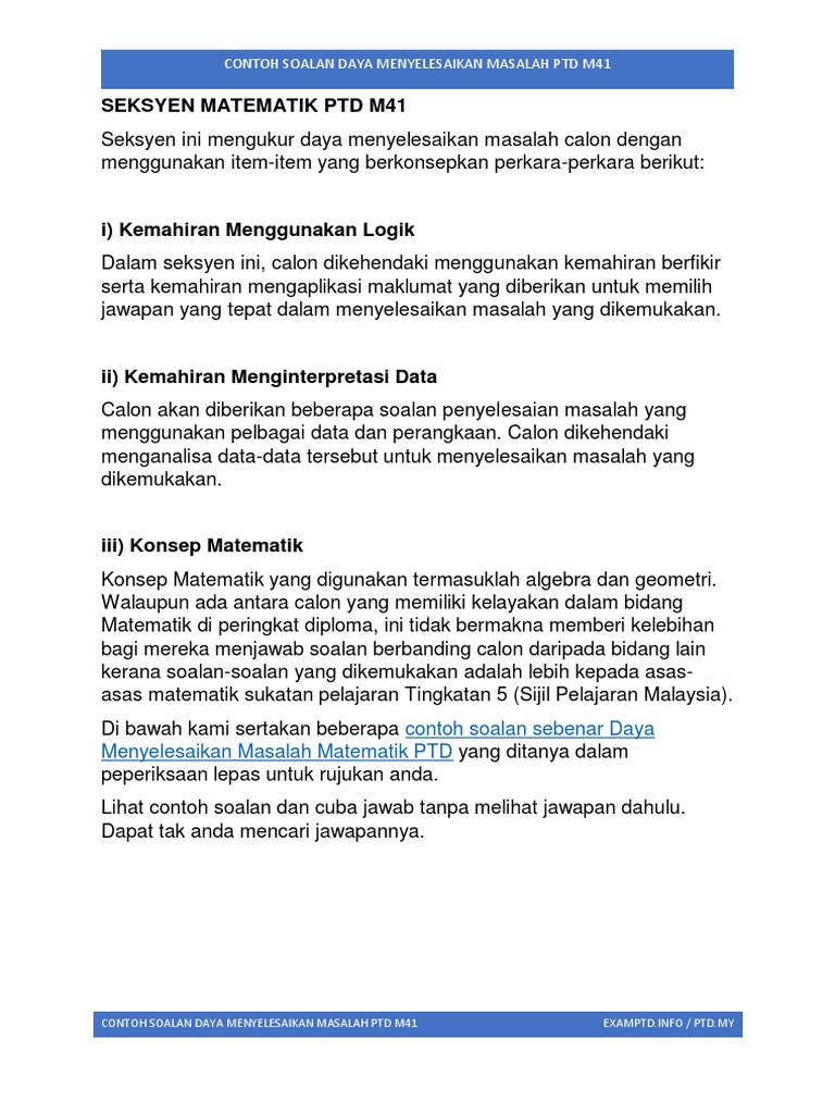 Contoh Soalan Peperiksaan Ptd 2017 Soalan Pengetahuan Am Soalan Daya Menyelesaikan Masalah Anda Akan Diberikan Beberapa Contoh Soal Math Formulas Math Exam