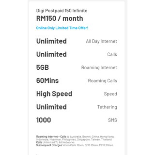 Digi Infinite 150 Postpaid Plan Unlimited Data High Speed Internet Tethering Hotspot Call Shopee Malaysia