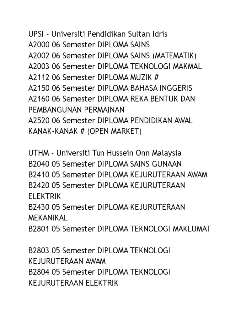 Senarai Program Diploma Yang Ditawarkan Di Ipta Seluruh Malaysia