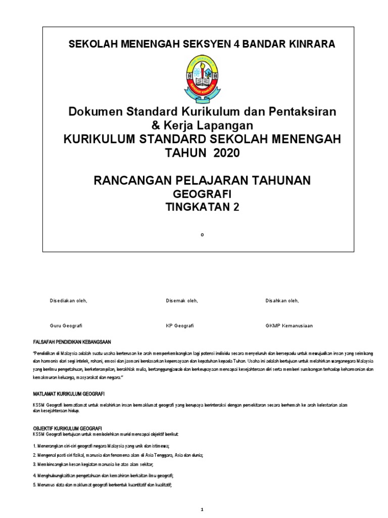 Dokumen Standard Kurikulum Dan Pentaksiran Kerja Lapangan Kurikulum Standard Sekolah Menengah Tahun 2020 Rancangan Pelajaran Tahunan
