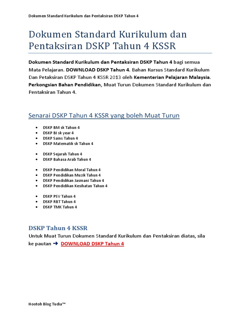 Dokumen Standard Kurikulum Dan Pentaksiran Dskp Tahun 4 Kssr Pdf Document