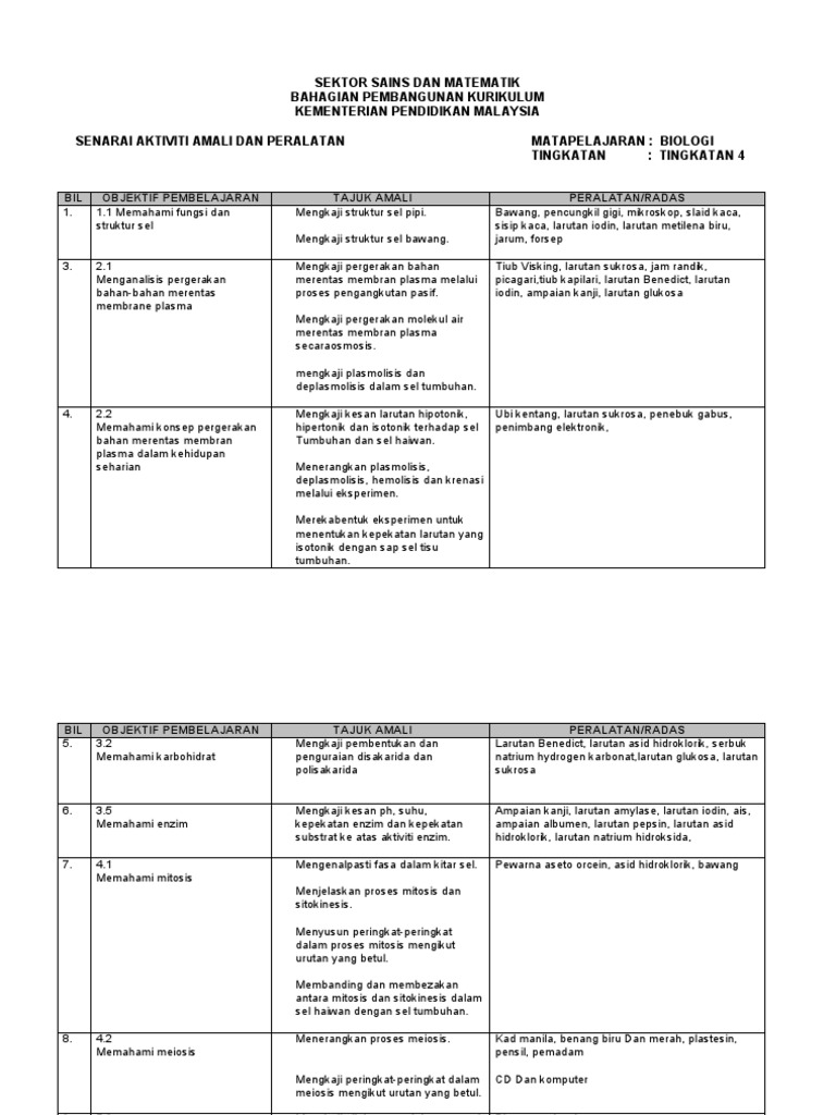 T4 Senarai Eksperimen Aktiviti Dan Bahan Biologi Tingkatan 4 Pdf