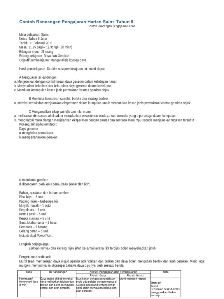 Contoh Rancangan Pengajaran Harian Sains Tahun 6 Doc